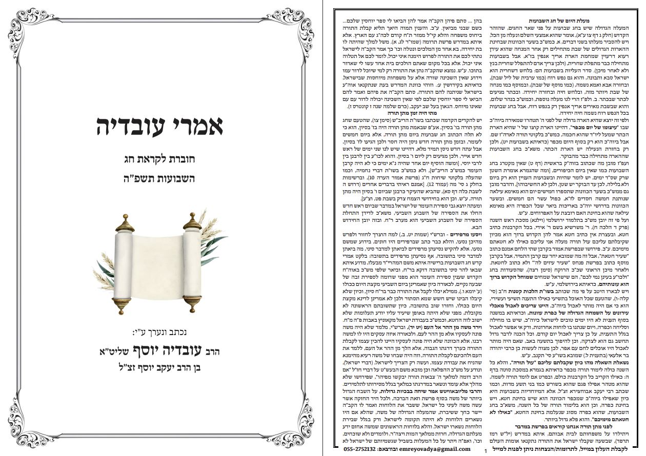 חג שבועות בכוונה 'כאשר ציוה ה'' הלכות 'אמרי עובדיה' ועוד...