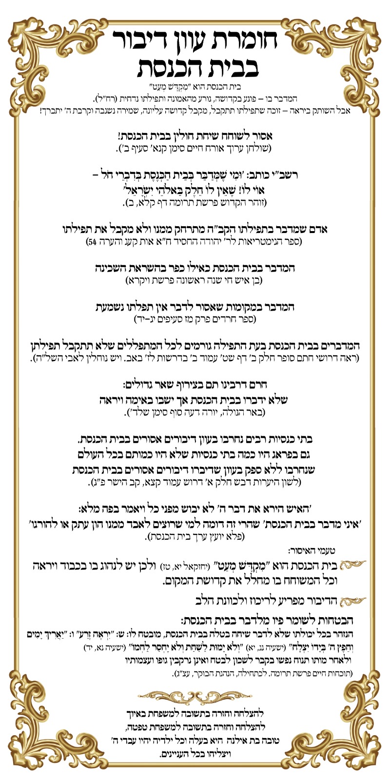 במטרה לחזק את שמירת הפה וקדושת המקום בבתי הכנסת, הוצב בימים האחרונים שלט מעוצב מזכוכית, המציג את חומרת הדיבור בבית הכנסת מתוך דברי חז"ל והפוסקים זיע"א.