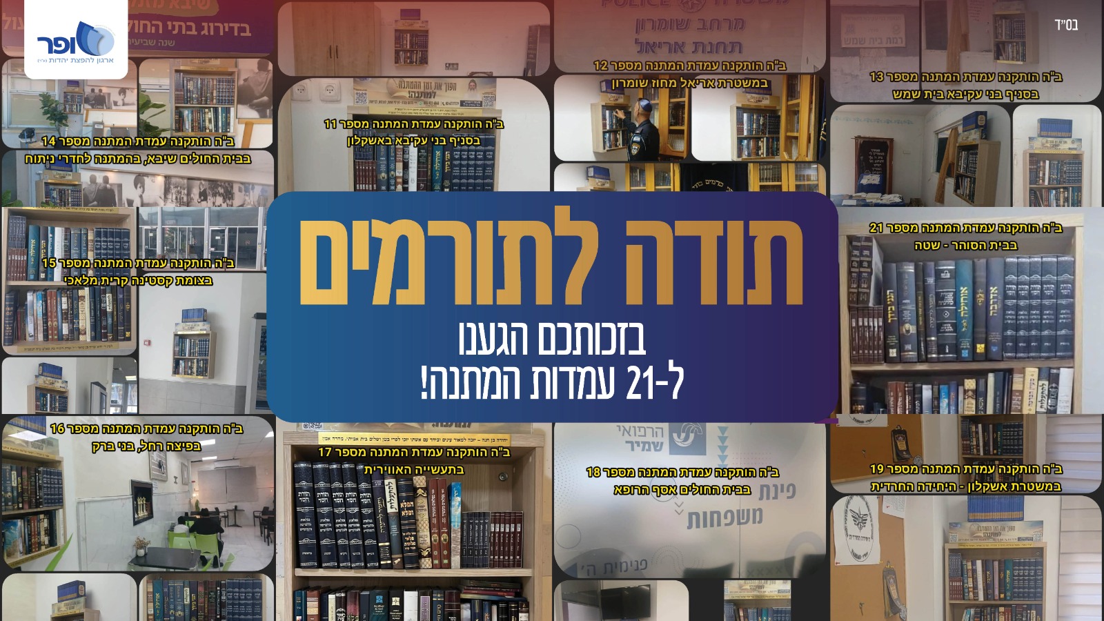 בזכות נדיבות התורמים הי"ו נוספו 24 עמדות המתנה חדשות ברחבי הארץ – בבתי חולים, תחנות משטרה, מוסדות ועסקים – לע"נ, לרפואה ולהצלחה. כל עמדה היא נדבך נוסף בזיכוי הרבים ובהפצת אור תורה. תודה לכל התורמים היקרים, אשר בזכותם נמשך האור בכל מקום.