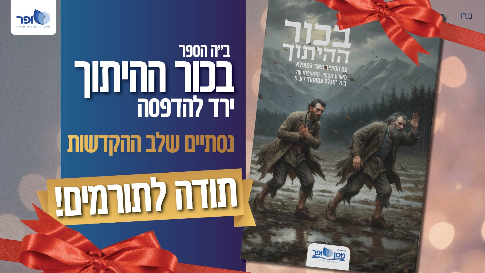 ב"ה הספר 'בכור ההיתוך' ירד לדפוס! שלב ההתרמה נסתיים בהצלחה גדולה בזכותכם. תודה עמוקה לכל התורמים היקרים השותפים להוצאת הספר לאור בקדושה ובפאר [התמונה להמחשה]