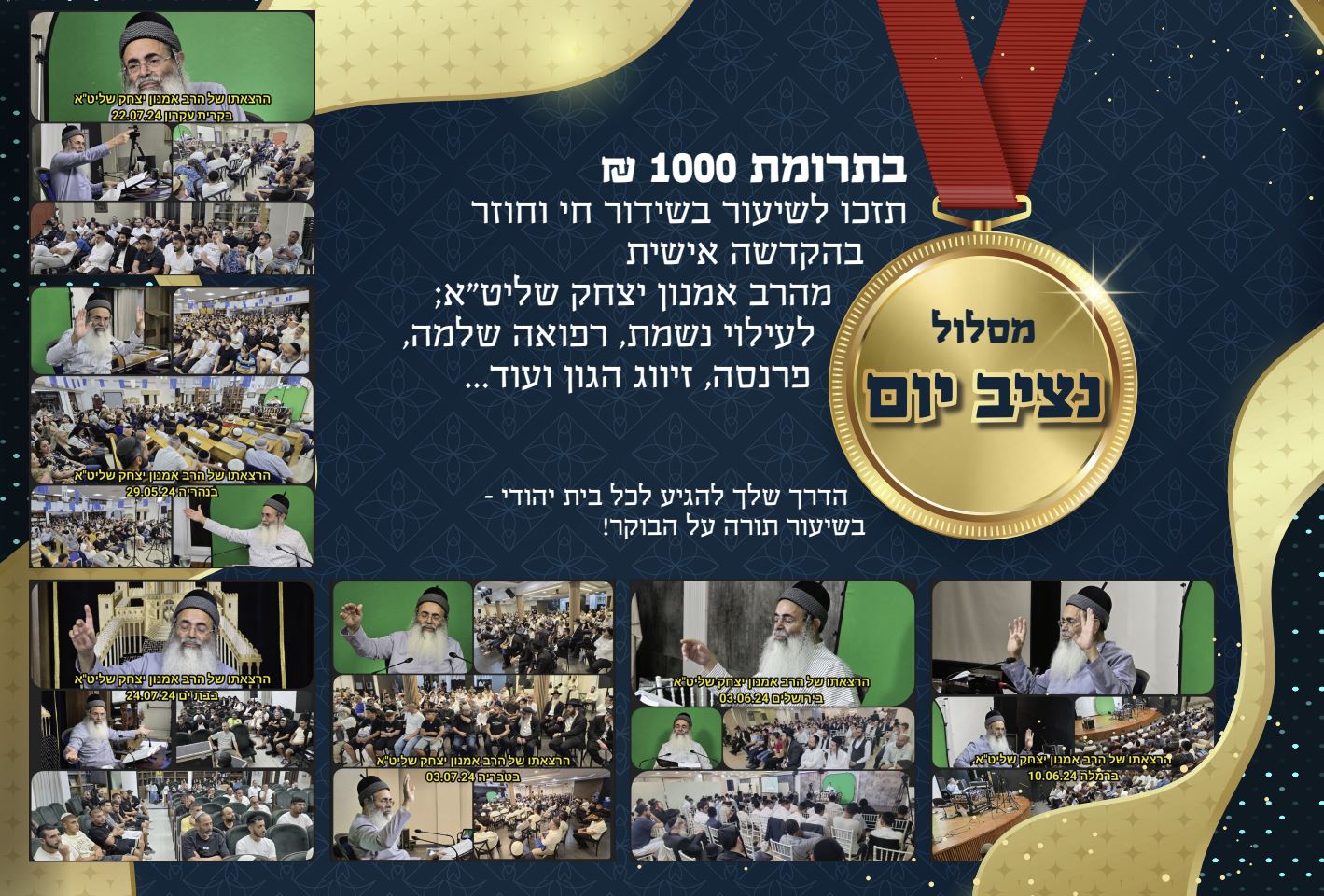 בתרומת 1,000 ₪ תזכו לשיעור בשידור חי וחוזר בהקדשה אישית מהרב אמנון יצחק שליט"א; לעילוי נשמת, רפואה שלמה, פרנסה, זיווג הגון ועוד.